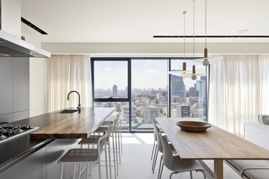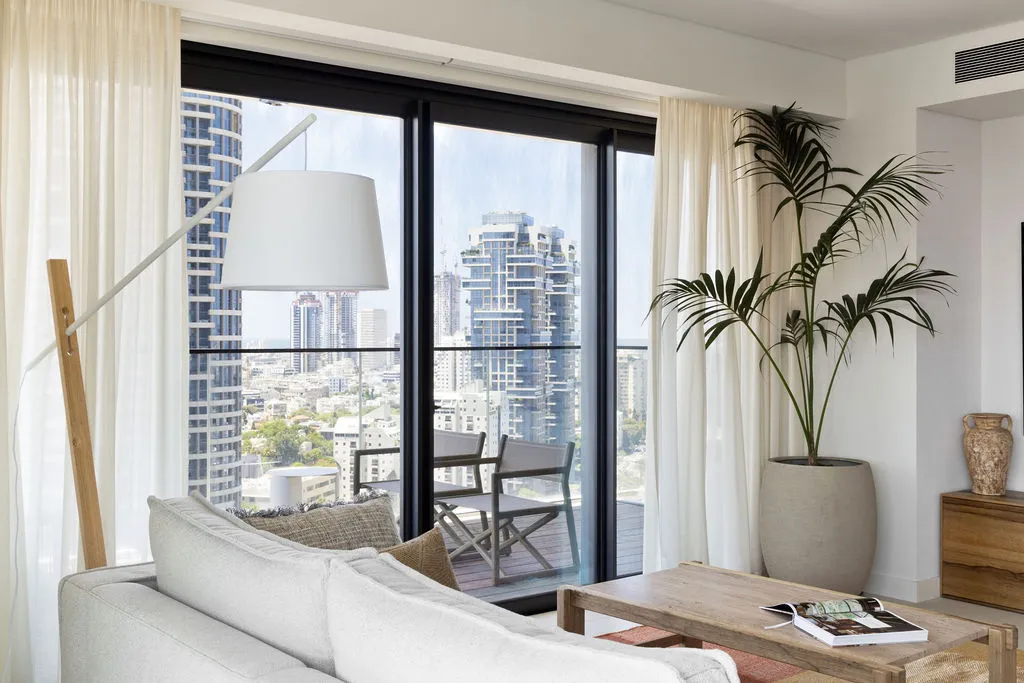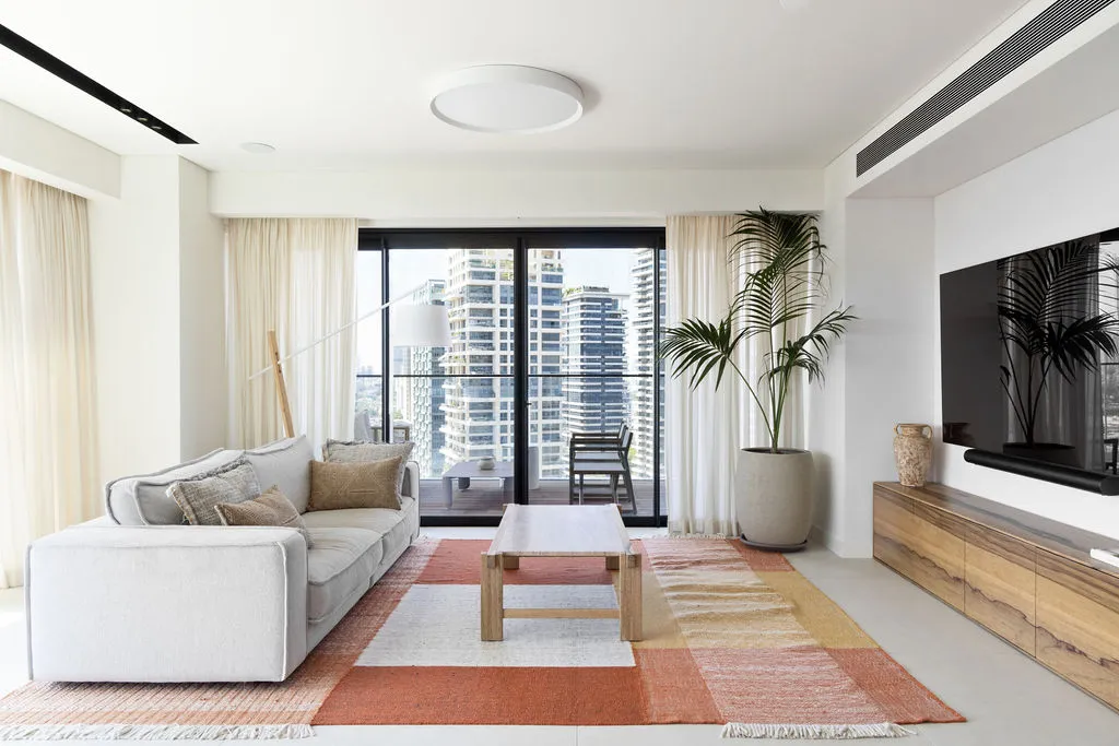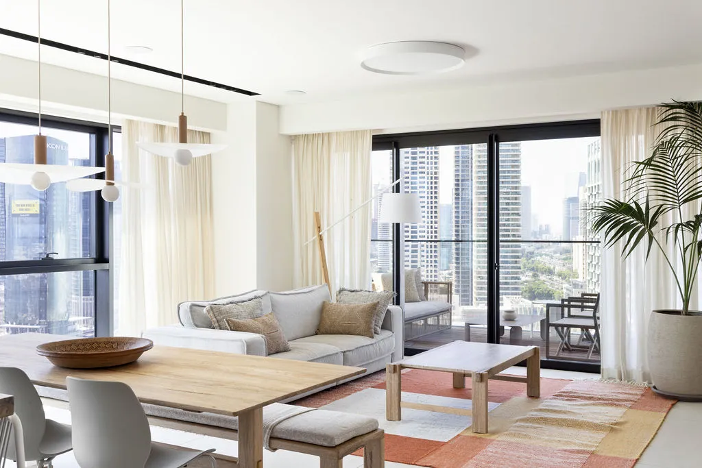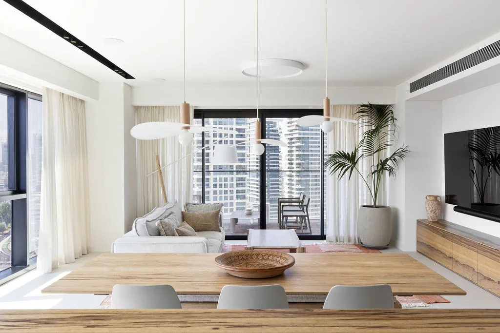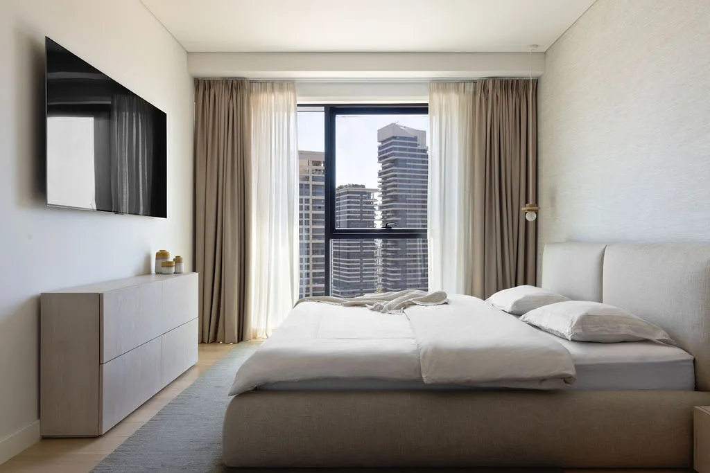 הלבשת הדירה הייתה מסע יצירתי מהפרטים הקטנים ועד התחושה שהחלל משדר, כולל סטיילינג מלא, התאמות חשמל ותאורה ונגרות מותאמת אישית. מתוך האור הטבעי והנוף האורבני פיתחתי שפה חמה והרמונית עם חומרים טבעיים, גוונים רגועים וקווים מודרניים-קלאסיים. שילבתי אלמנטים שמספרים את סיפור הבית – תאורה בעבודת יד, אמנות מקורית, טפט טבעי ורהיטים בנגרות אישית. בחדר הארונות יצרתי עבורם חלל מפנק ומדויק שממשיך את האווירה של כל הבית.