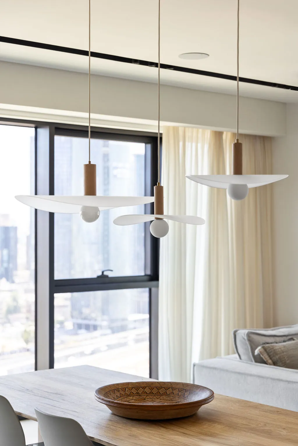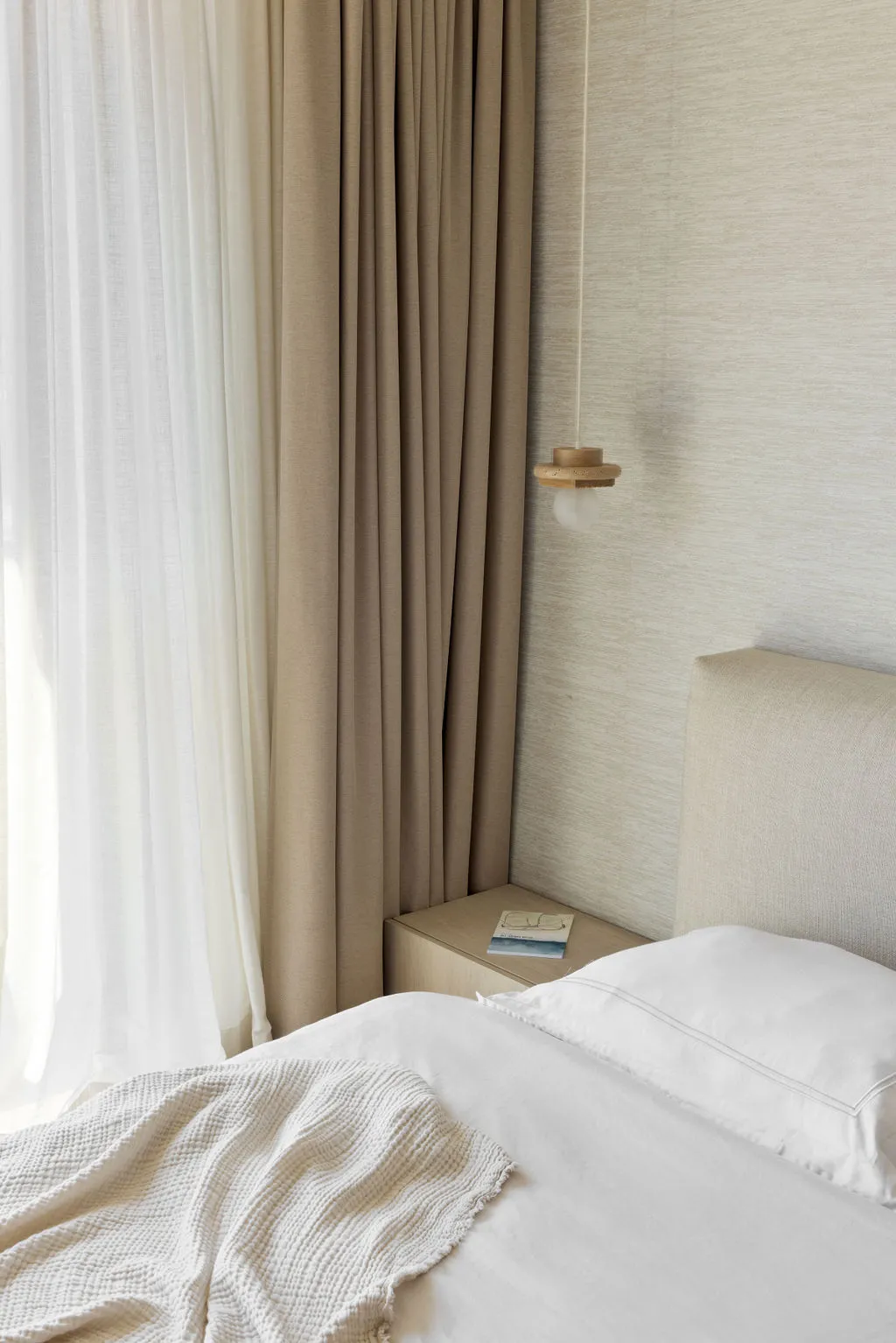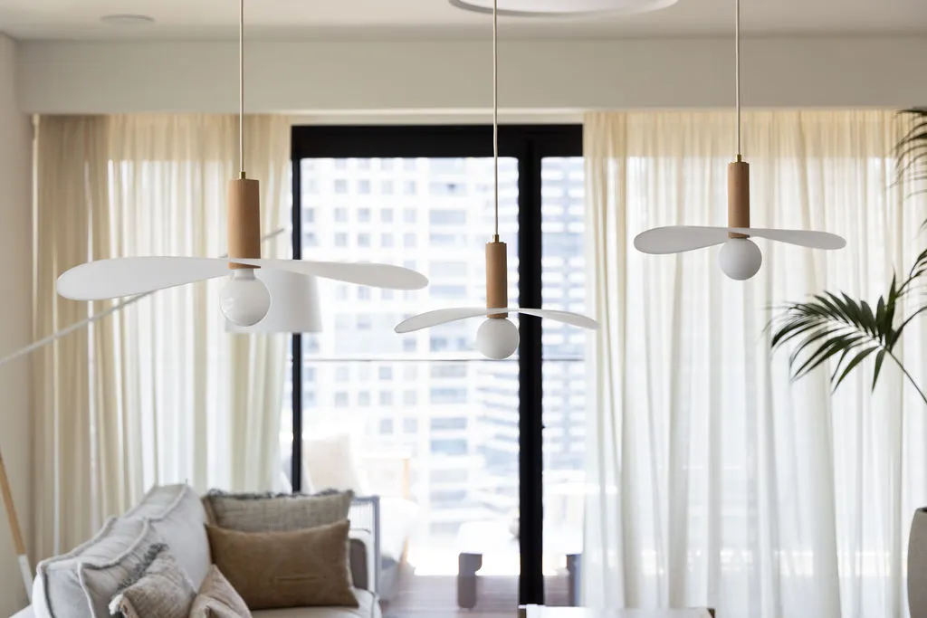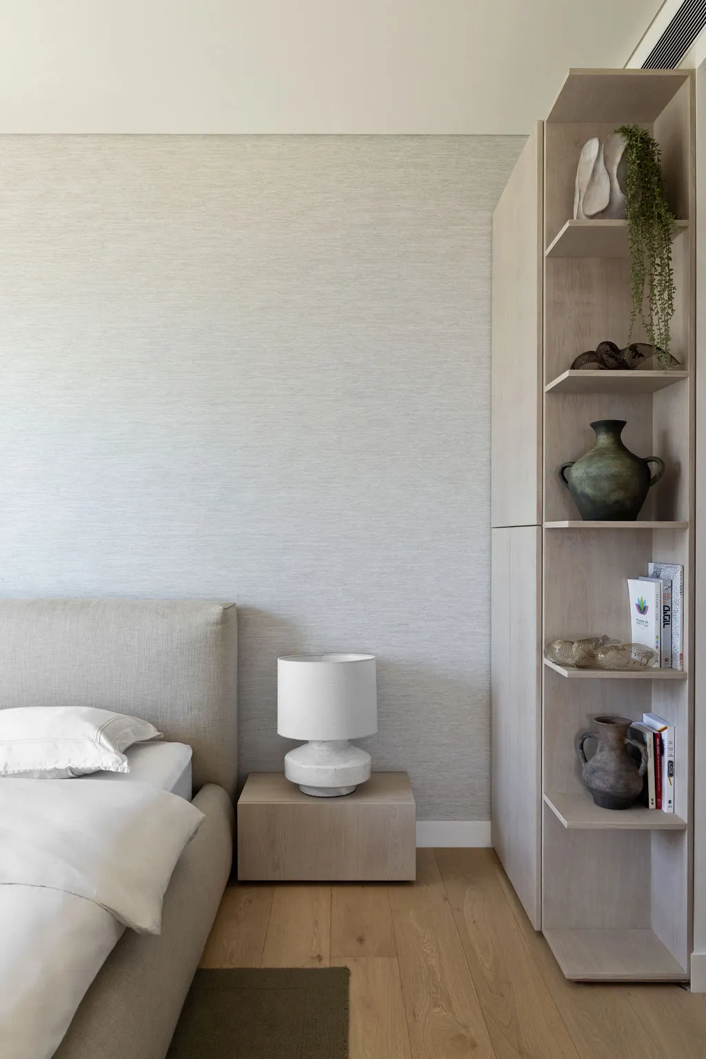 הלבשת הדירה הייתה מסע יצירתי מהפרטים הקטנים ועד התחושה שהחלל משדר, כולל סטיילינג מלא, התאמות חשמל ותאורה ונגרות מותאמת אישית. מתוך האור הטבעי והנוף האורבני פיתחתי שפה חמה והרמונית עם חומרים טבעיים, גוונים רגועים וקווים מודרניים-קלאסיים. שילבתי אלמנטים שמספרים את סיפור הבית – תאורה בעבודת יד, אמנות מקורית, טפט טבעי ורהיטים בנגרות אישית. בחדר הארונות יצרתי עבורם חלל מפנק ומדויק שממשיך את האווירה של כל הבית.