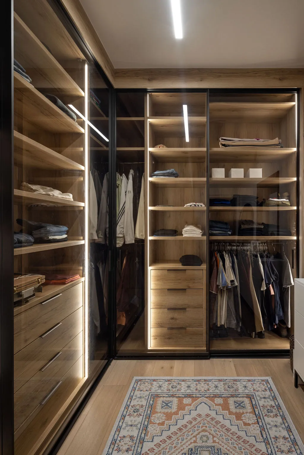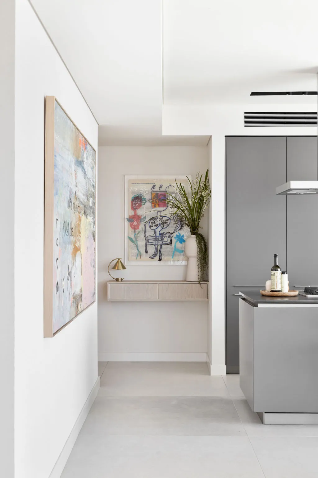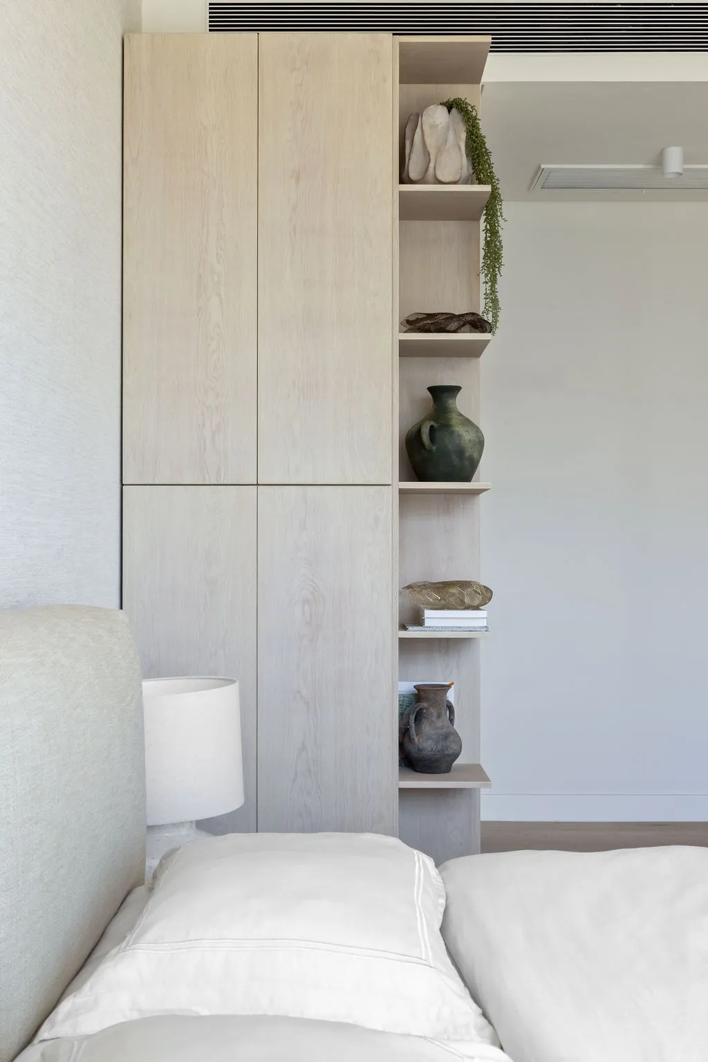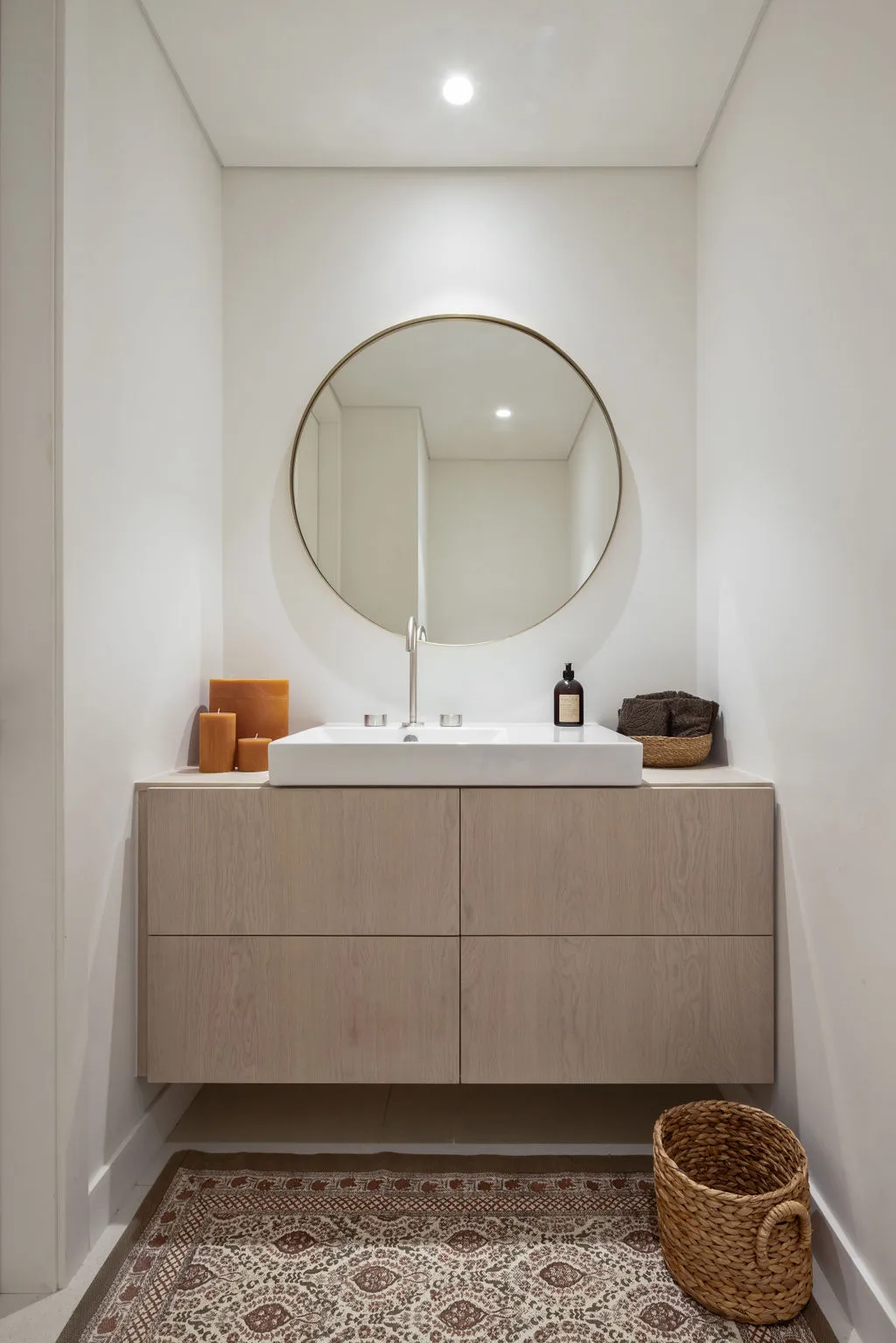 הלבשת הדירה הייתה מסע יצירתי מהפרטים הקטנים ועד התחושה שהחלל משדר, כולל סטיילינג מלא, התאמות חשמל ותאורה ונגרות מותאמת אישית. מתוך האור הטבעי והנוף האורבני פיתחתי שפה חמה והרמונית עם חומרים טבעיים, גוונים רגועים וקווים מודרניים-קלאסיים. שילבתי אלמנטים שמספרים את סיפור הבית – תאורה בעבודת יד, אמנות מקורית, טפט טבעי ורהיטים בנגרות אישית. בחדר הארונות יצרתי עבורם חלל מפנק ומדויק שממשיך את האווירה של כל הבית.