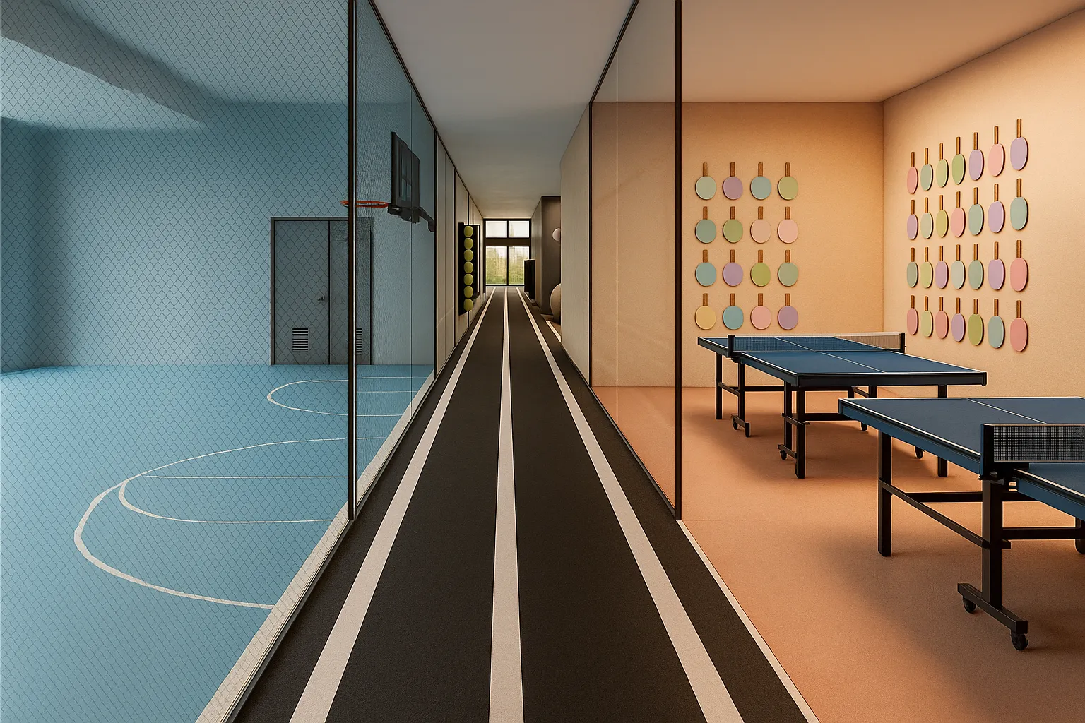 הקונספט העיצובי מבוסס על הגדרה ויזואלית ברורה לכל מתחם כל פעילות מקבלת צבע מוביל הלא מקובל בג'אנר, נועז ולא קונבנציונלי המייצר שפה שמזהים מיד: טניס ורוד, פינג פונג אפרסק, כדורסל תכלת, טיפוס בגווני טורקיז ועוד. כך נוצר חלל ייחודי, צבעוני ובלתי נשכח.